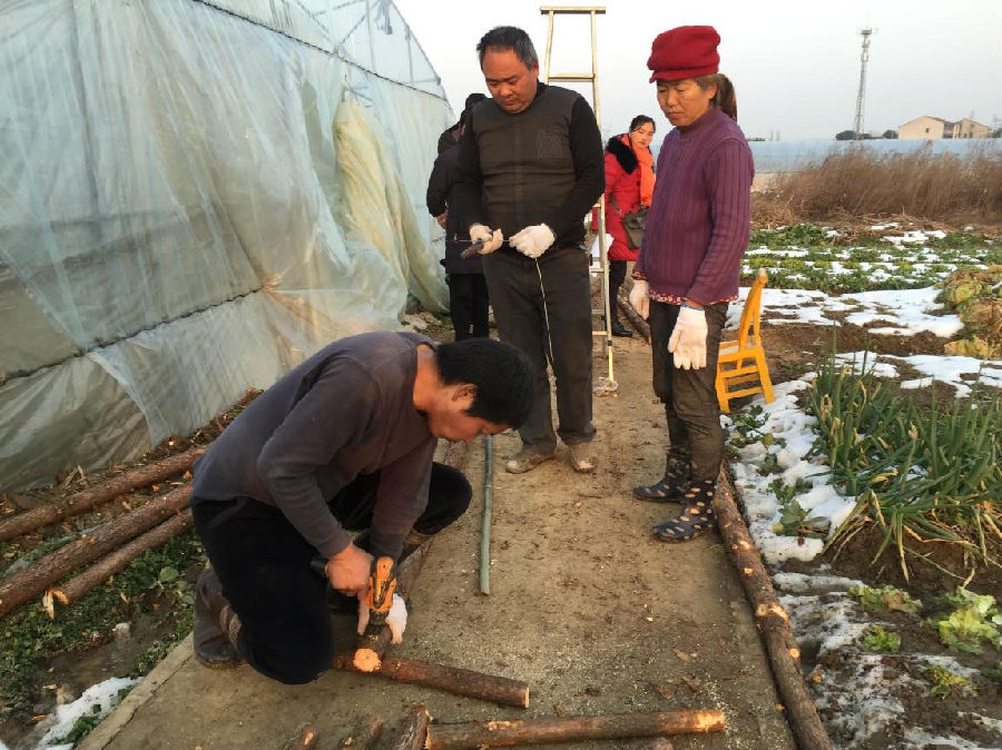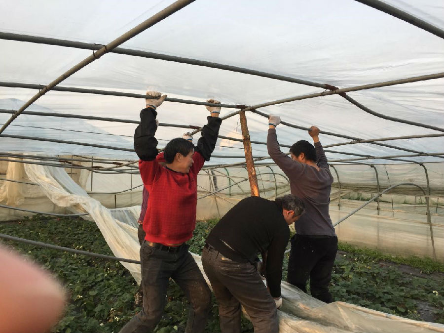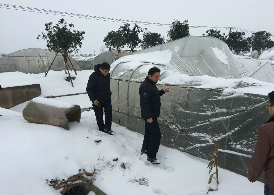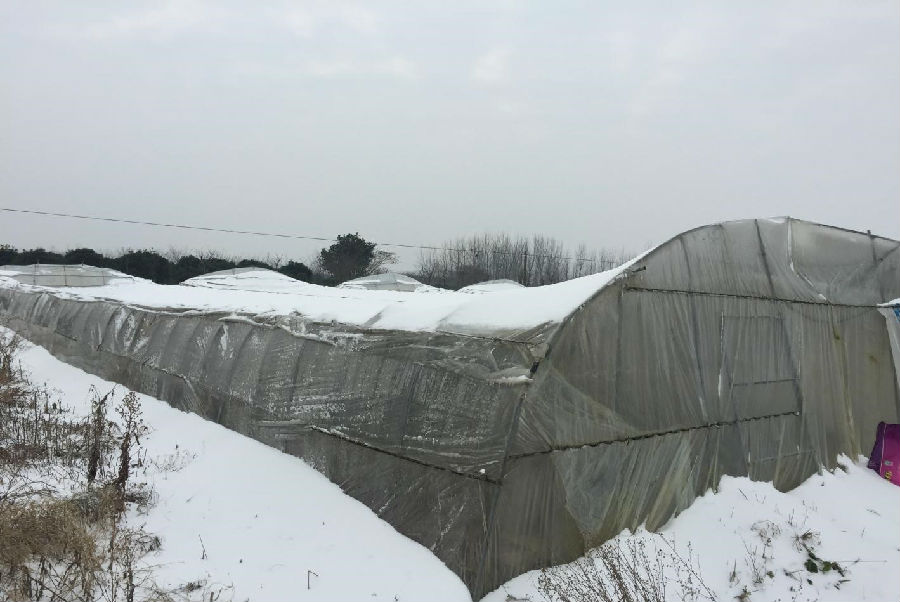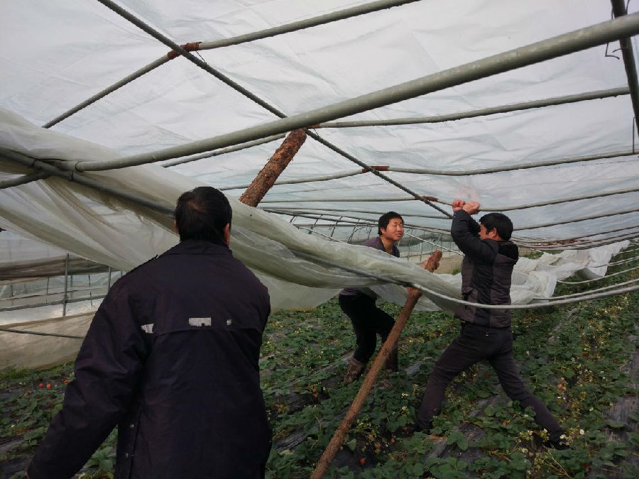 张湾街新民村是南水北调中线工程丹江口水库移民建制村,1月26日—27日,遭遇暴雪,该村300亩钢架大棚全部坍塌。灾情发生后,区政府和区农委主要领导第一时间赶赴受灾现场,指导抗灾。为积极应对本次冰冻暴雪灾害天气,最大限度减少移民经济损失,区农委迅速组织专家实地踏勘,提出指导意见,建议对目前仍在生长,又不能拆棚的作物(草莓、薯尖等),采用棚内立桩的办法,在坍塌大棚内安装2.5米高的木桩,撑起大棚顶部,并用铁丝固定,恢复作物生长空间,待作物收获后再拆棚重建。1月31日,区农委组织立桩1000个送到新民村,当日恢复2个大棚,预计3天内可先期将12亩草莓大棚全部恢复。